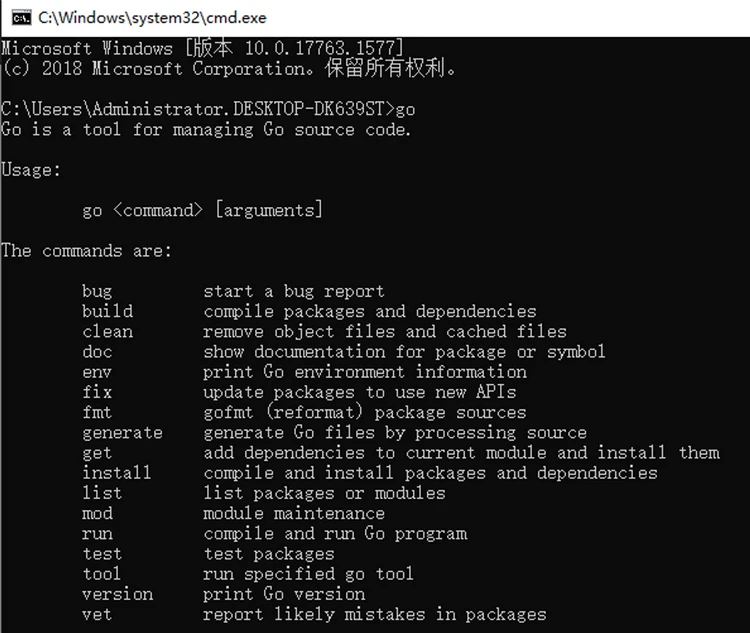 环境变量设置后,在命令中输入go。如果看到下面截图结果,说明一件配置成功了。