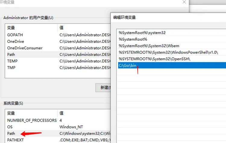 修改系统变量Path,追加C:\Go\bin 。此处一定要注意,如果你上面更改了安装目录,一定要以安装目录为准,切勿盲目的照抄,否则可能会导致配置不生效。