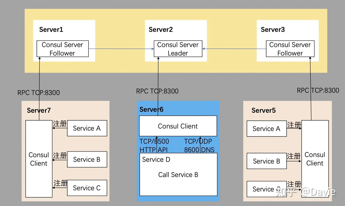 4、Consul client转发注册消息。Consul Client 可以认为是无状态的,它将注册信息通过RPC转发到Consul Server,服务信息保存在Server的各个节点中,并且通过Raft实现了强一致性。