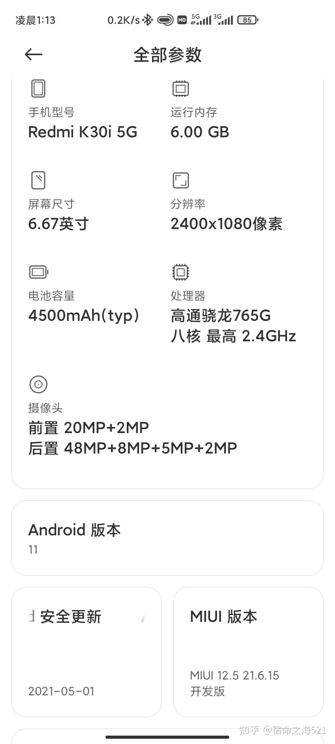 以红米k30i为例,当前版本为开发版MIUI12.5 6.15,安卓安全更新日期为5.1。