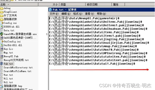 这进行这一步之前,你可以先打开登陆器配置器下面的PAK.txt,查看补丁路径和密码,如上图所示,我这里的路径是E:\热血传奇\,那么我们打开这个目录,看补丁有没有在下面,文件是否缺少,如果没有,你就把补丁下载下来,把里面的文件复制进去。