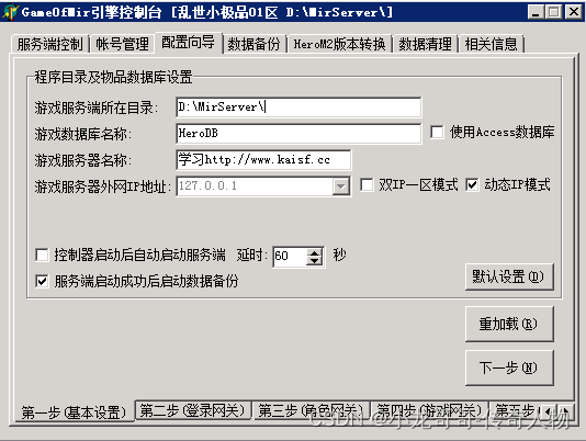 4.配置引擎,打开D盘,找到版本(Mirserver)下面会有个引擎GameOfmir引擎控制器.如图打开,点击配置向导,默认设置,取消勾选双IP,然后下一步,其他的一直默认下一步即可,引擎配置完毕,保存配置