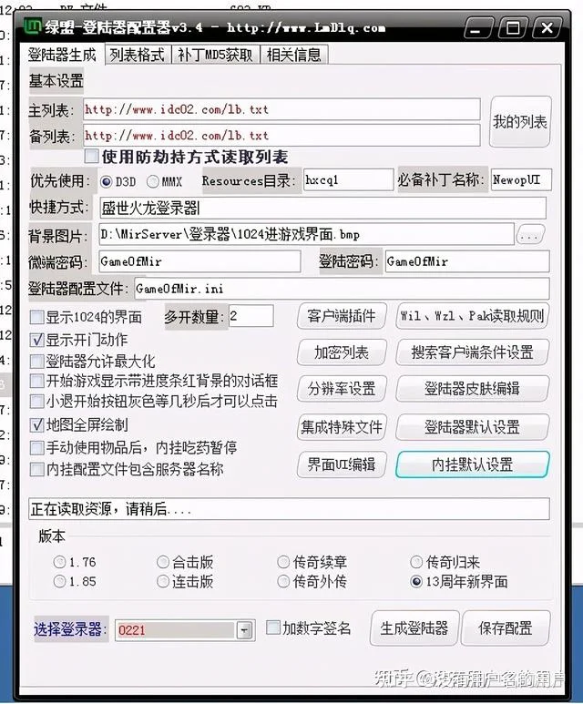 登录器怎么配置呢,别着急,有的玩家他的版本打开不是绿盟登录器,可能是战盟也可能是一些论坛或者其他作者自己做的登录器,这个没关系,都可以统一换成绿盟,只要是gom引擎的打开登录器配置器怎么配置呢?主列表就是你的登录器列表地址,我们找到版本自带的网站文件夹,在里面创建一个txt文本,你可以上传一份自己的列表格式,如果没有的话可以来http://www.pkp123.cn:88上面拿一份,然后自行修改地址和端口就行,创建修改好了,我们打开自己的电脑桌面,用浏览器打开搜索一下看能否读取,读取不到的话你创建好登录器 是会连接列表失败的,前面是你的域名,没有域名就是ip加端口,斜杠后面是你的列表名称很多玩家问过我,我的版本架设出来能不能改名字,我告诉你是可以的,创建方式就是你搭建这个服的登录器想叫什么名字就叫什么名字,这个没影响,也有不少网友问过我,原登录器配置出来的皮肤好丑啊,可以换吗? 我也是回答你可以的,找到图中的登录器皮肤编辑,我们右键打开,里面会有皮肤补丁和文件选择,你的版本自带什么皮肤,有多少皮肤,你都可以自由使用,如果觉得不够霸气,不够好看,可以找ps美工给你做出来做到这里不少网友问我,这里面还有那么多东西要配置,我们都要一一去配置吗? 很多东西你后期懂了之后可以自己来尝试,目前你不需要,你只需要以最快的速度架设起这个服上游戏测试,不少网友问我,这个版本怎么选择,我开的180的版本,他选的是176的 或者是185,连击什么的,这个影响关系不大,一般你打开配置的时候它默认是什么就是什么,你保存配置,生成登录器即可