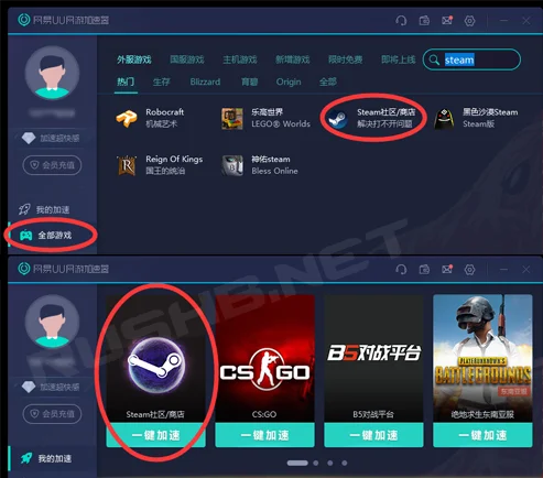 打开网易UU网游加速器并注册登录,点击左边栏的“全部游戏”,搜索“Steam”,找到“Steam社区/商店”并点击,然后点击其“一键加速”。