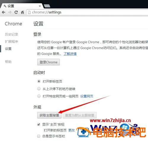 2、在设置菜单中找到点击外观->获取主题背景按钮。