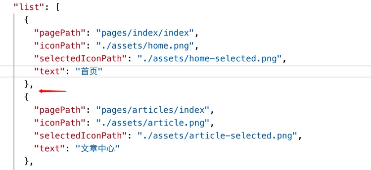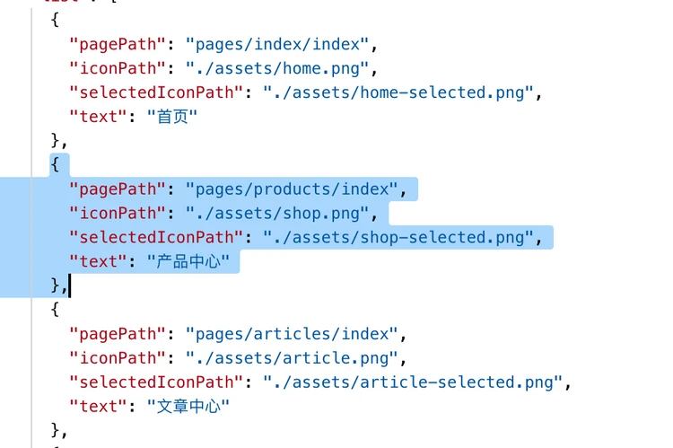 同时还需要将产品中心的导航添加上。打开app.json,找到首页,在它下方加入产品中心,如图