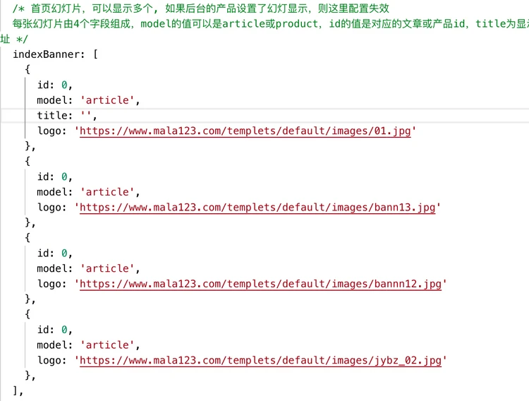 每张幻灯片由4个字段组成,model的值可以是article或product,id的值是对应的文章或产品id,title为显示的名称,title可以不填,logo为图片地址。如图