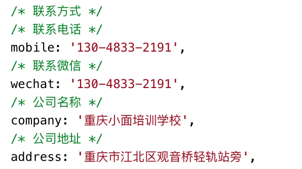 联系方式设置 联系方式包括公司名称、公司地址、联系电话、联系微信,它们会显示在联系我们的页面里,以及各个页面的悬浮按钮。如图