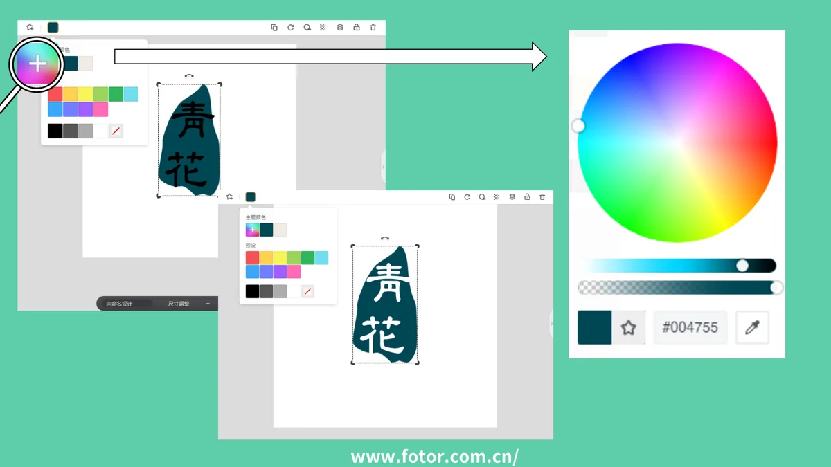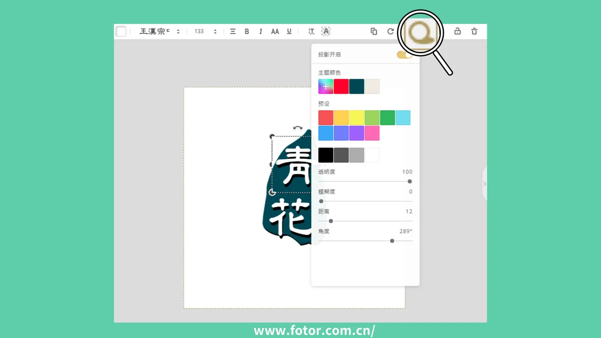 我不喜欢红色的logo,既然产品名称叫“青花”,那我就自己选了一个国画颜料的颜色作为打底印章的颜色,并且将字体颜色也改成了白色。编辑页面的上方就有关于“颜色”的设置哦~