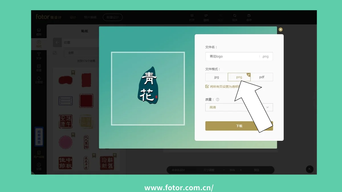 设计完成啦,单击“保存”按钮后,弹出窗口选择文件格式“.png”,下面会出现将logo背景更改为透明的选项,打勾,下载。