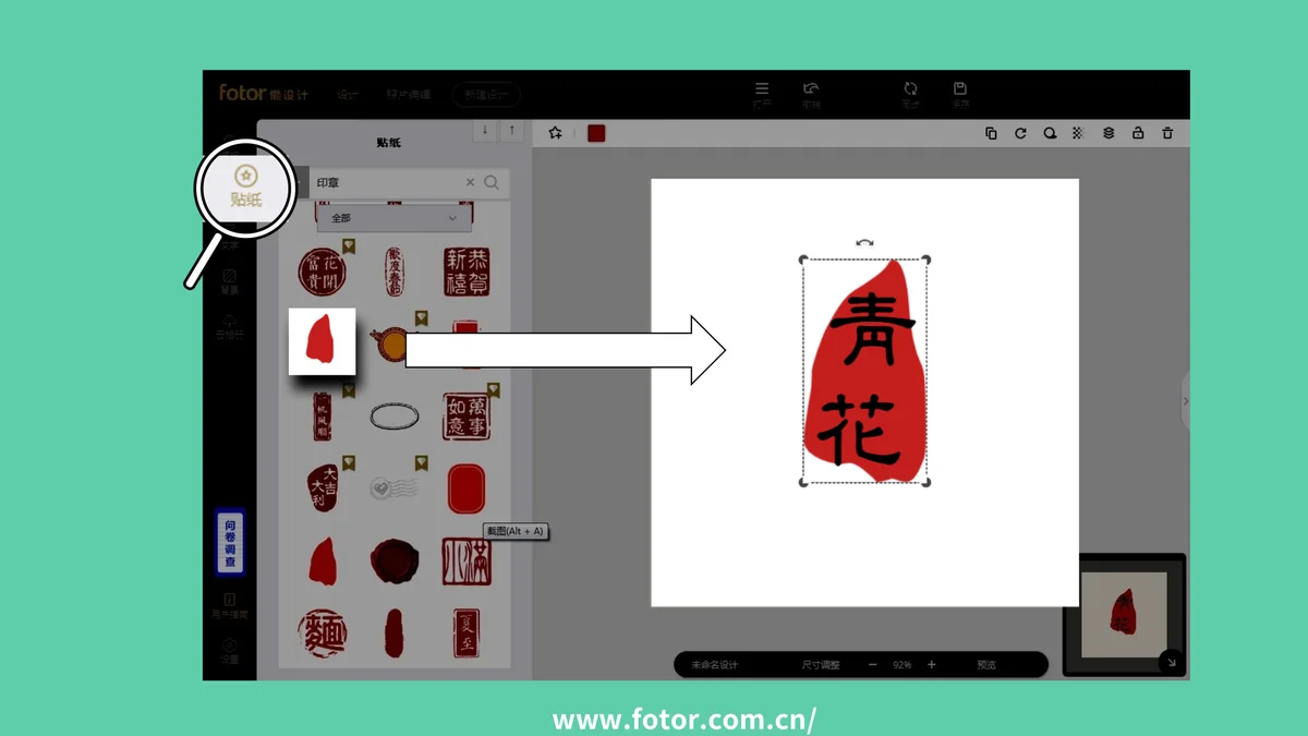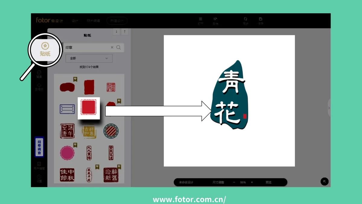 删去了我认为多余的装饰之后,我突发奇想,觉得删掉了的印章元素可以运用到我的logo设计中来,因此我在“贴纸”一栏输入了“印章”,选择了我喜欢的印章模型,作为logo的打底。