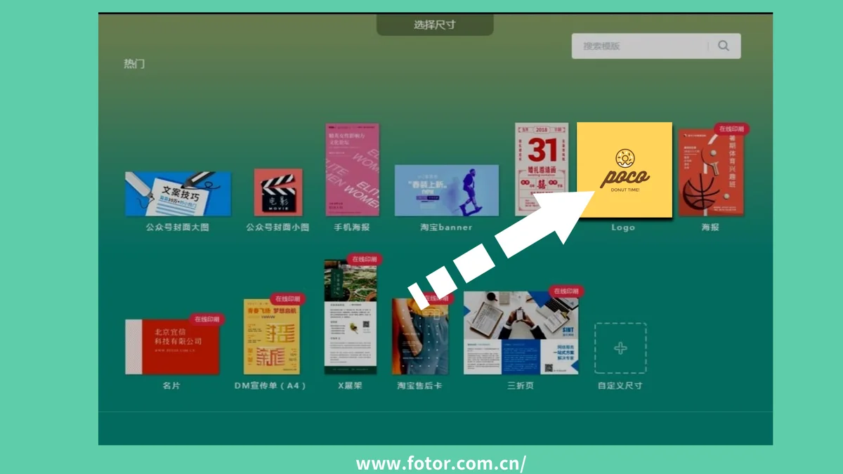 点击启动页面中的“开始设计”,接下来,点击logo尺寸,进入编辑界面,查看Fotor懒设计的logo模板。