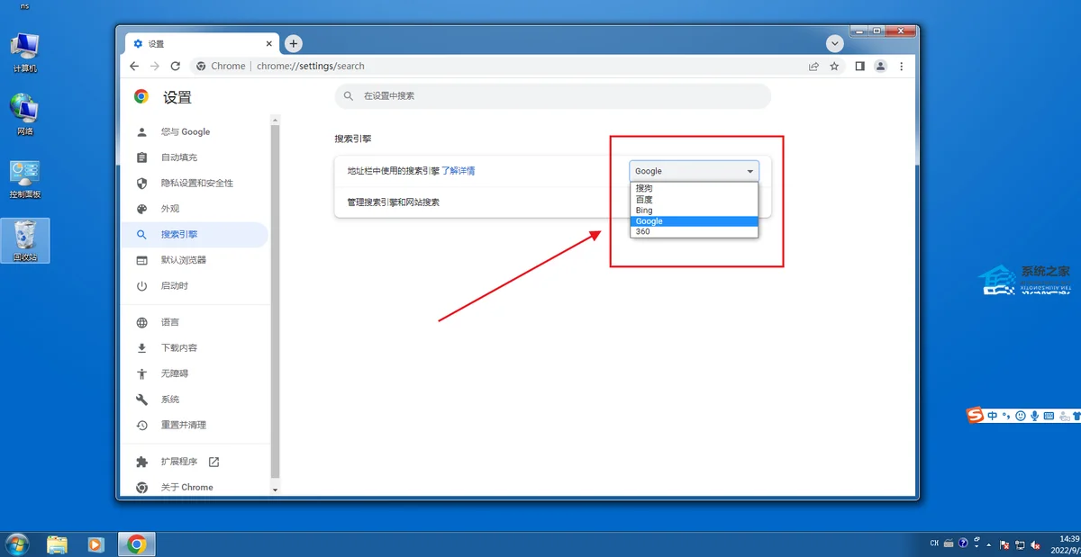 3、之后点击搜索引擎边上的小三角,将谷歌的搜索先换成其他的,设置好后刷新当前的页面就能正常显示了。