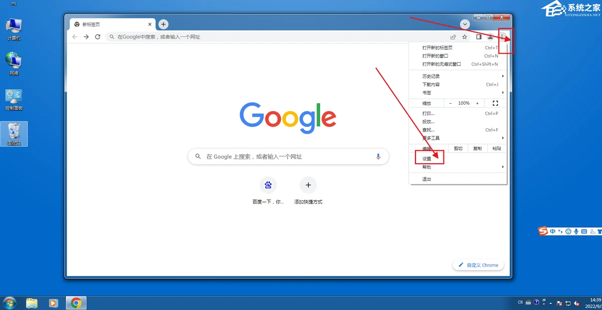 1、先进入谷歌浏览器,然后点击右上角的三个点,随后在菜单中点击“设置”。