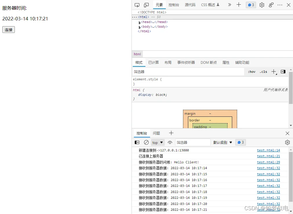 一个显示服务器时间的段落,一个触发websocket连接的按钮