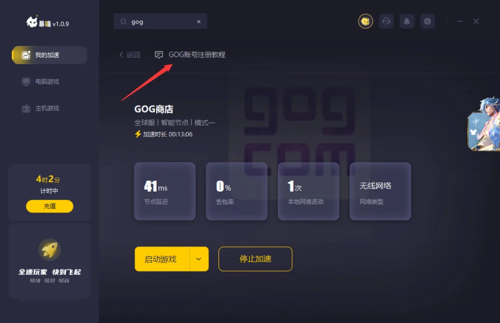 1,使用暴喵加速器,可以快速进入对应游戏官网。可在浏览器进行下载暴喵加速器。登录暴喵客户端,搜GOG进行加速,加速界上方点击GOG账号注册教程,进入按照步骤进行注册即可。(有账号的同学搜西娅2粉碎进行加速,并进行领取。)