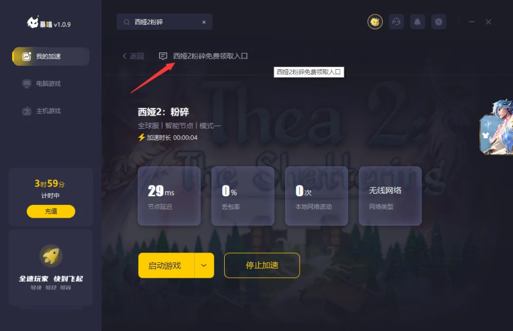 2,账号注册完成,加速切换至西娅2粉碎,加速界面上方,点击领取入口进行。