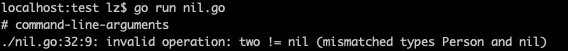 ./nil.go:32:9: invalid operation: two != nil (mismatched types Person and nil)