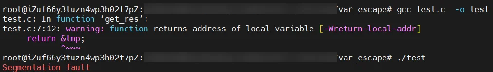 这里可以看出编译程序,报了 warning 了,不过不影响程序的编译 , 这个 warning 报错信息是 因为我们返回了临时变量的地址,C 编译器检测到了,给我们抛出了一个 warning