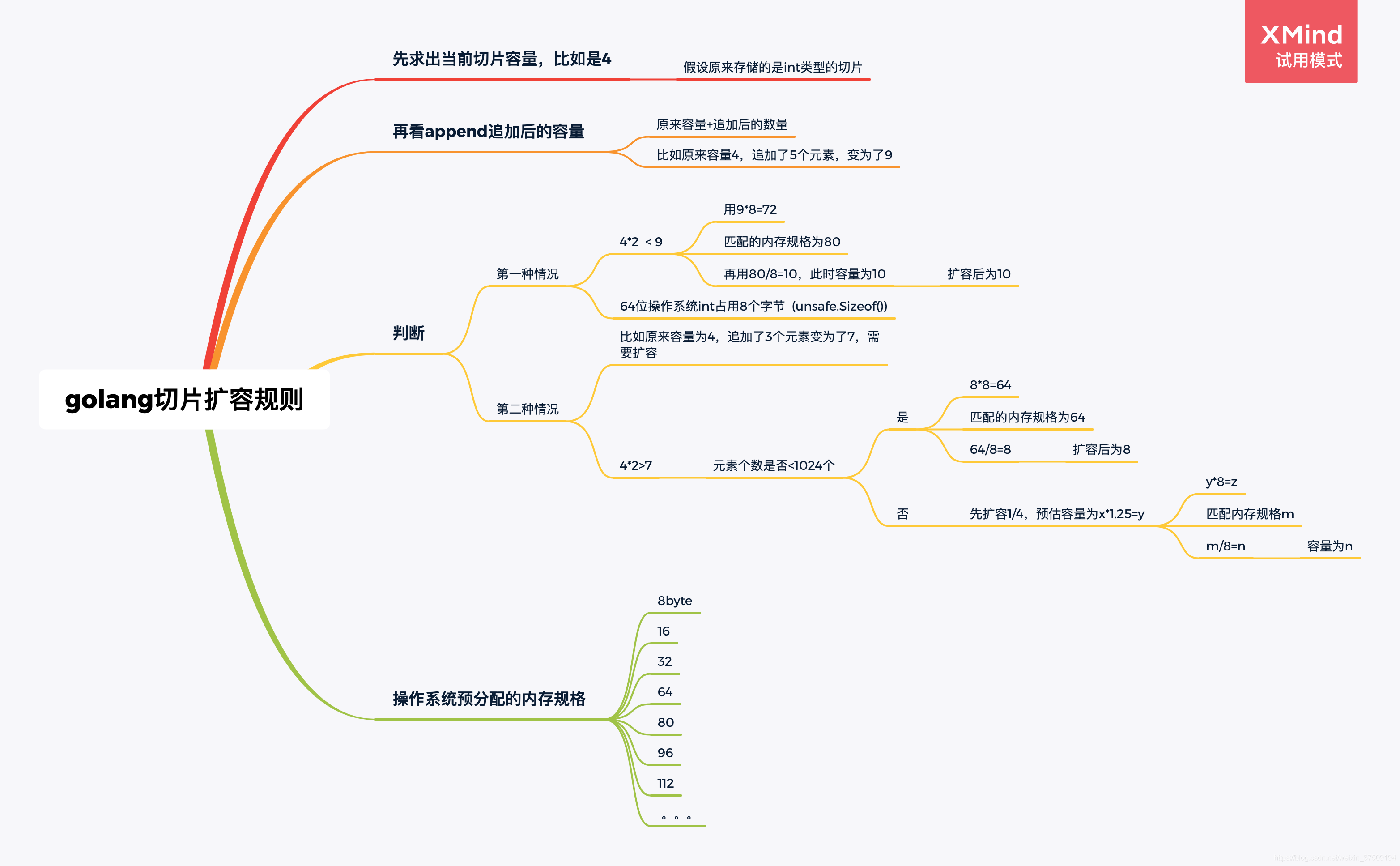 扩容规则:如果切片的容量小于1024个元素,那么扩容的时候slice的cap就乘以2;一旦元素个数超过1024个元素,增长因子就变成1.25,即每次增加原来容量的四分之一,然后再根据扩容后的容量去匹配内存规格。