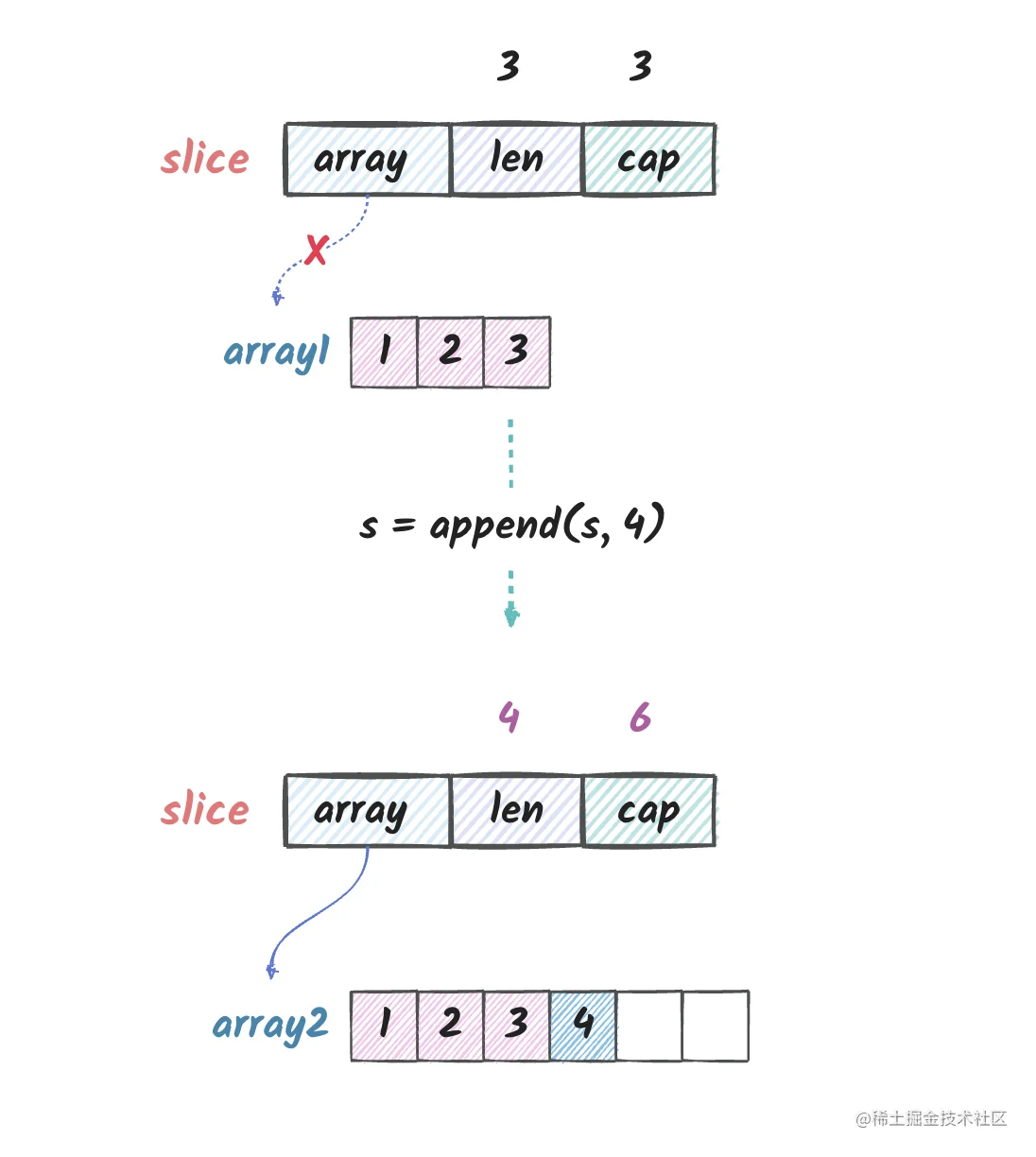 go 的切片我们都知道可以自动地进行扩容,具体来说就是在切片的容量容纳不下新的元素的时候, 底层会帮我们为切片的底层数组分配更大的内存空间,然后把旧的切片的底层数组指针指向新的内存中: