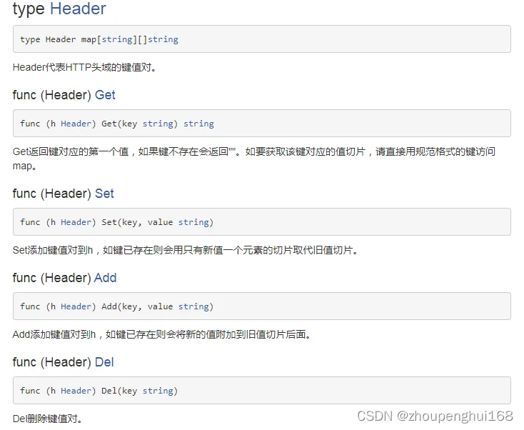 通过Request结果中的Header字段来获取请求头中的所有信息,Header字段的类型是Header类型,而Header类型是一个map[string][]string,下面是Header类型及它的方法