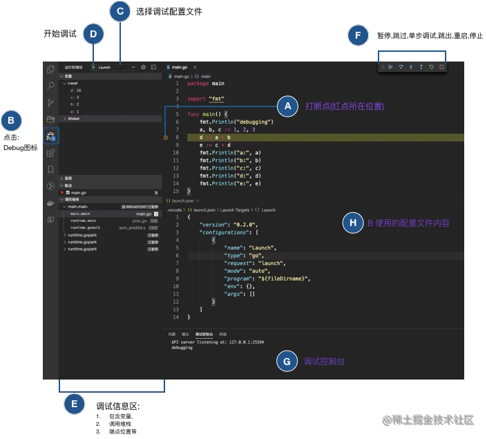 要使用 VS Code 进行远程调试, 那么需要在远程服务器上运行 headless delve 服务。下面这个示例假定了 你要调试的程序与你在同一目录下, 如果没有, 请参考 dlv debug 命令上的用法文档。