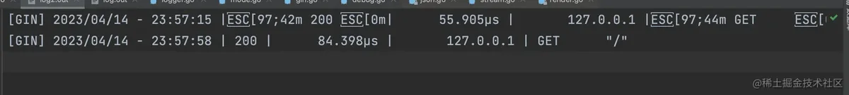 如下,我们将gin的日志输出到文件中,并分别查看使用gin.ForceConsoleColor函数和不使用gin.ForceConsoleColor的日志区别。