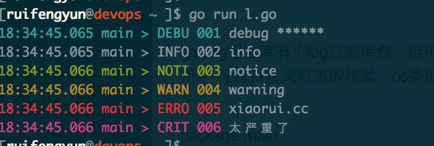[ruifengyun@devops ~ ]go run l.go 18:26:36.456 main ▶ DEBU 001 debug ****** 18:26:36.456 main ▶ INFO 002 info 18:26:36.456 main ▶ NOTI 003 notice 18:26:36.456 main ▶ WARN 004 warning 18:26:36.456 main ▶ ERRO 005 xiaorui.cc 18:26:36.456 main ▶ CRIT 006 太严重了 [ruifengyun@devops ~ ] cat log.txt info notice warning xiaorui.cc 太严重了