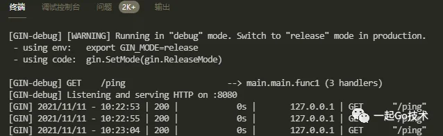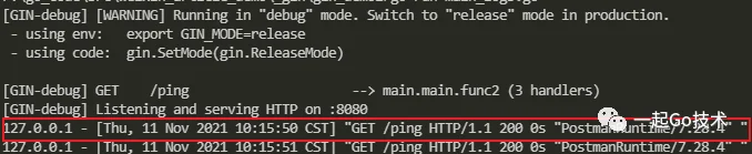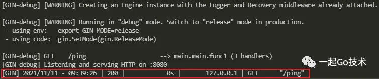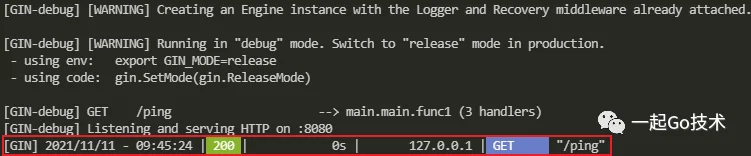 代码运行起来,在访问127.0.0.1:8080/ping时,日志输出变为了设置的格式: