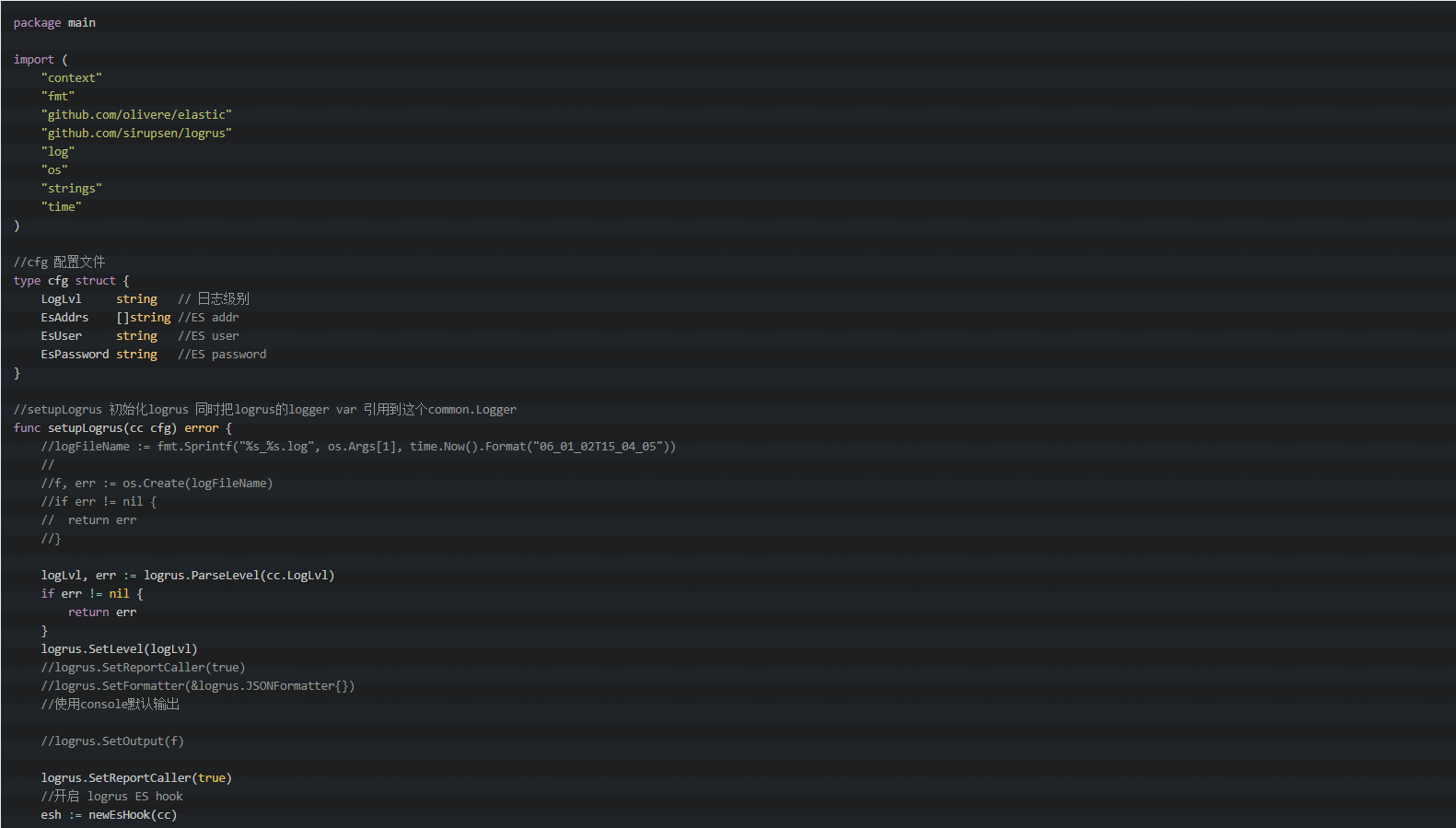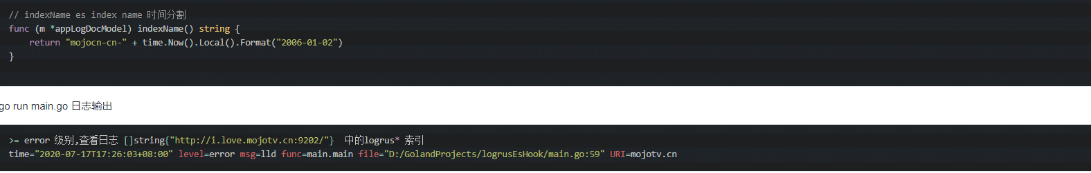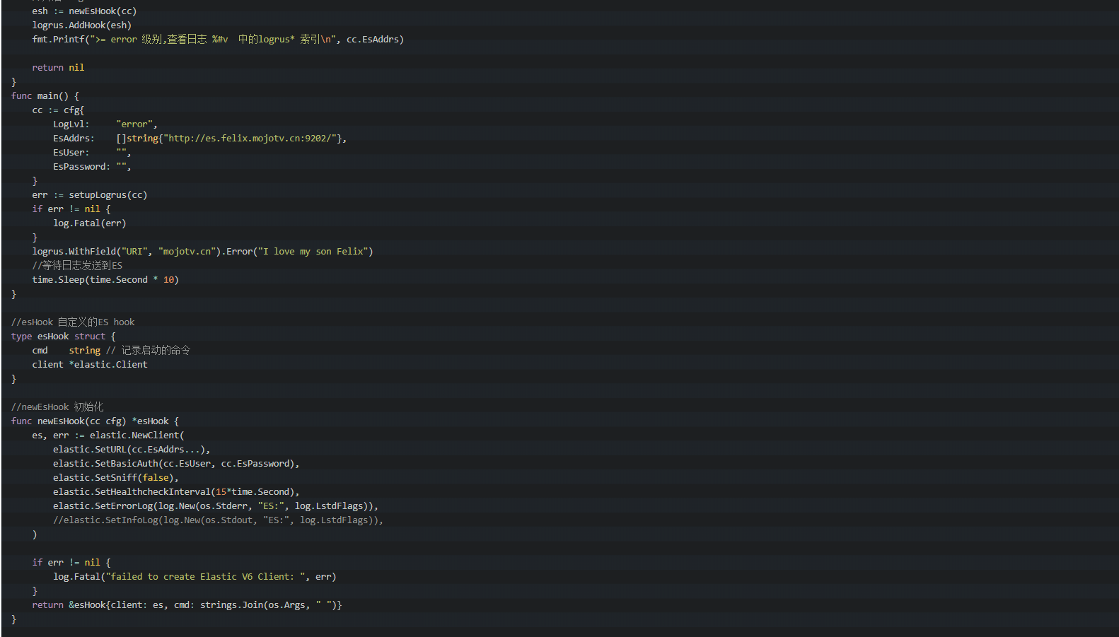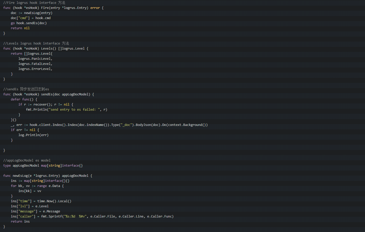 3. 编写实现 logrus HOOK interface (核心代码)main.go 完整代码: https://github.com/mojocn/eslogrushook