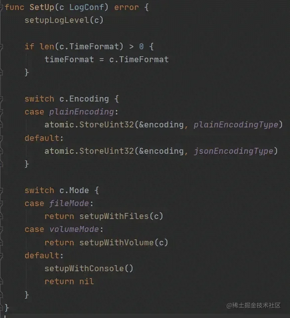 继续看到 logx.SetUp() 中的具体实现 , 函数需要传入的数据结构是这样的 LogConf