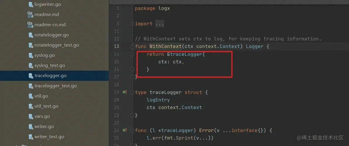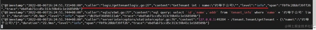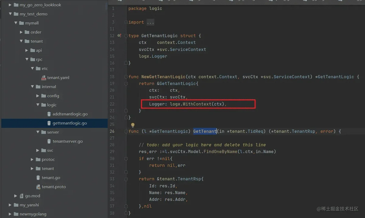 我们可以看到当调用了NewGetTenantLogic 方法之后,实际上是会调用 logx.WithContext(ctx) 初始化一个 traceLogger 的句柄