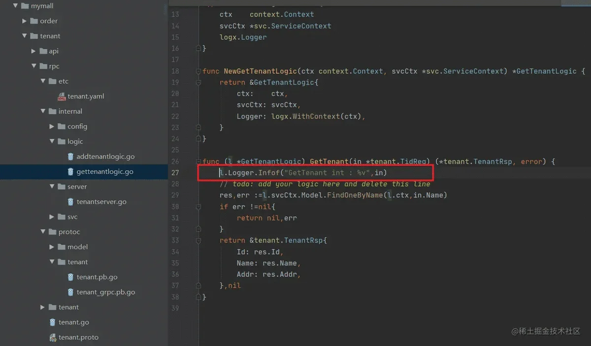 实际上我们可以直接看到,我们之前实现的 GetTenant rpc 方法