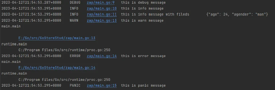 - Error,Dpanic级别的记录,会在堆栈中跟踪文件,warn不会