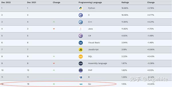 我查了一下《》一文中2022年1月份Go的排名为13名,上图中2021年12月份是19名的数据应该是错误的,相对2021年12月份,Go实际排名上升1位。