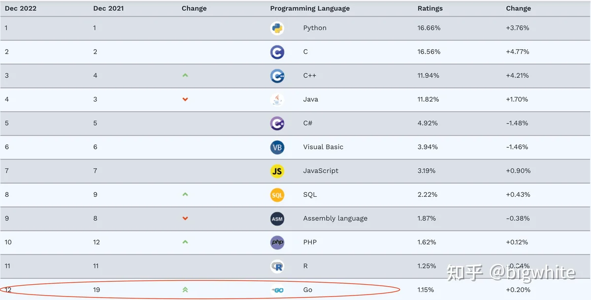 Go的稳定不仅体现在Go语法特性的演化上,Go语言在各大语言排行榜上的排名也进入了相对稳定区,以为例,下面是2022年12月份的排名截图: