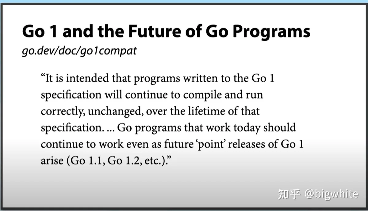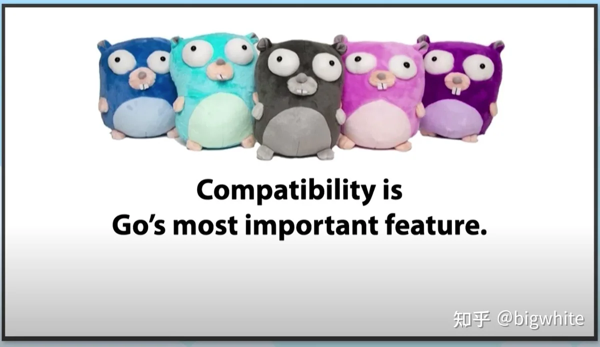 Russ Cox的这一观点代表了Go核心团队,也代表着Go演进未来演进的主基调。同时,Russ明确给出结论:不会有Go2了,Go 1.xy会一直持续下去。Russ甚至提出:兼容性才是Go最重要的feature: