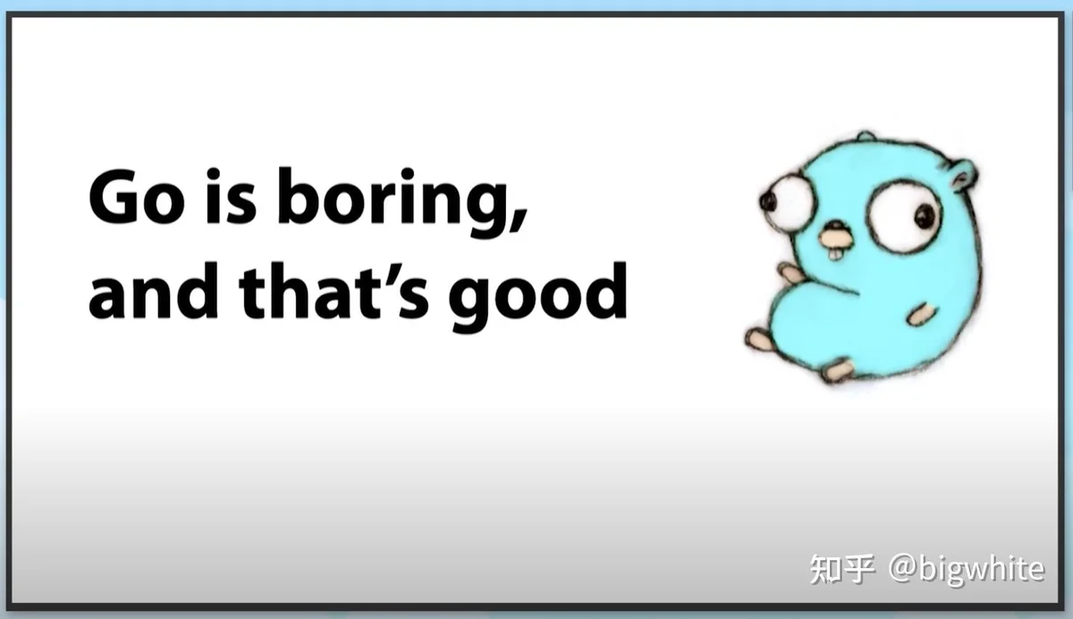 在今年的线下GopherCon大会上,Go核心团队技术Leader Russ Cox发表名为的主题演讲,在这个演讲中,Russ Cox借用了Go is boring的这一说法,并称That is good!