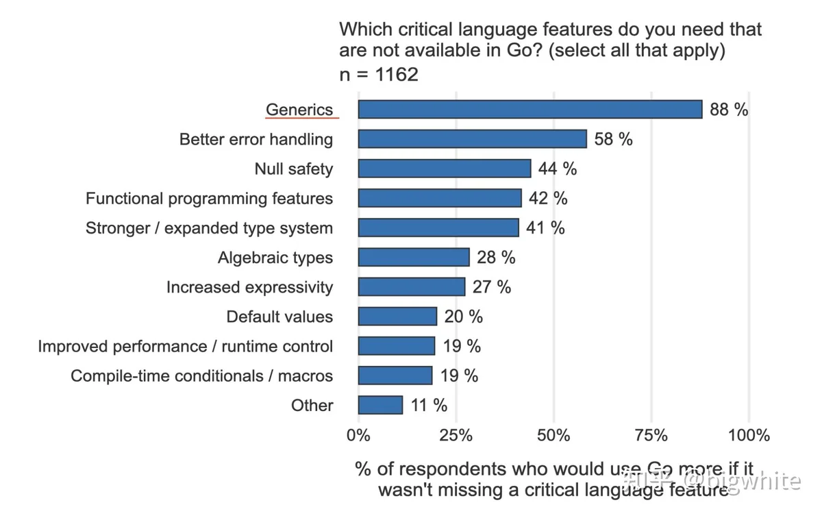 其实,从Go开源那一天开始,Go核心团队就没有间断过对泛型的探索,并一直尝试寻找一个理想的泛型设计方案,但始终未能如愿。直到近几年Go团队觉得Go已经逐渐成熟,是时候下决心解决Go社区主要关注的几个问题了,包括泛型、包依赖以及错误处理等。其中泛型常年在Go官方用户调查报告的“你最想要的Go语言特性”这项调查的榜单上霸榜,下图摘自2020年度Go官方用户调查结果: