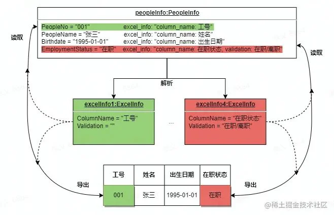 上面给出的是创建 Excel 文件的示例。读取 Excel 文件的过程是类似的,首先从二进制数据创建出文件对象,然后根据文件对象中的每一列数据,生成对应的结构体对象。示例代码如下。