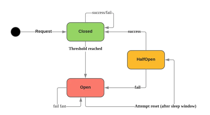 - 关闭:让请求通过的默认状态。如果请求成功/失败但低于阈值,则状态保持不变。可能出现的错误是超过最大并发数和超时错误。
