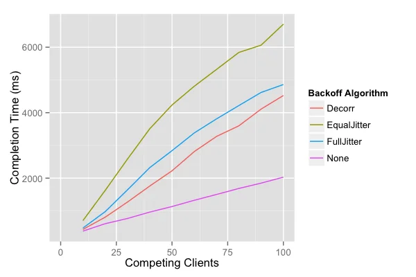 客户端数量与负载总量和完成时间之间存在相关性。要确定最适合系统的方法,有必要在客户端数量增加时进行基准测试。详细的实验可以在本文中找到。我的建议是在去抖动和全抖动之间。