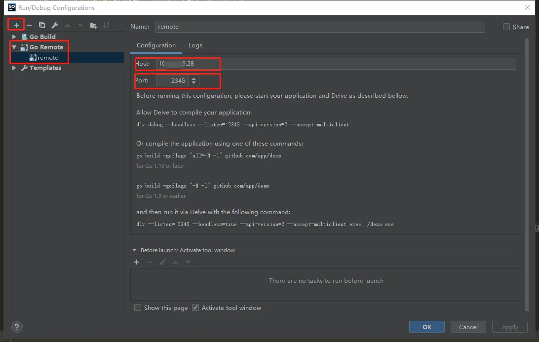 填写linux 服务的ip 和 delve的端口,自己设置防火墙.