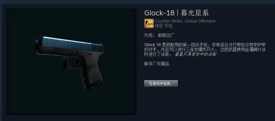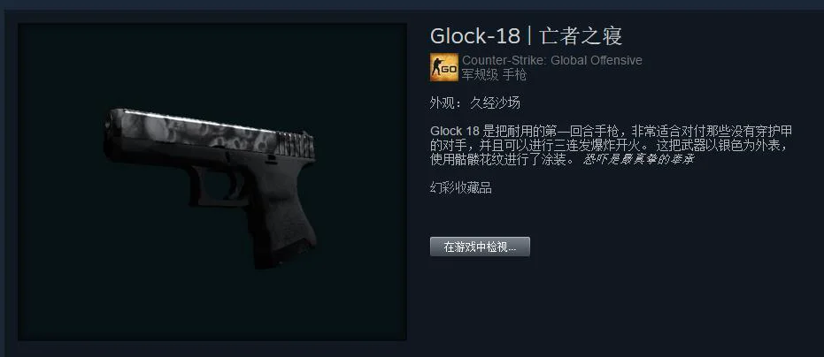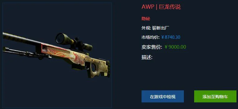 价格昂贵到无可附加,而且居然目前在市场售卖的并没有任何一款暗金成色的,但是这款皮肤是有暗金成色的,可见其珍贵的程度,在市场上目前最高只有略磨品质的售卖,价格直逼2000STEAM里的人民币,这个价格折算成真正的人民币也要1400-1500,更不要说暗金的价格。