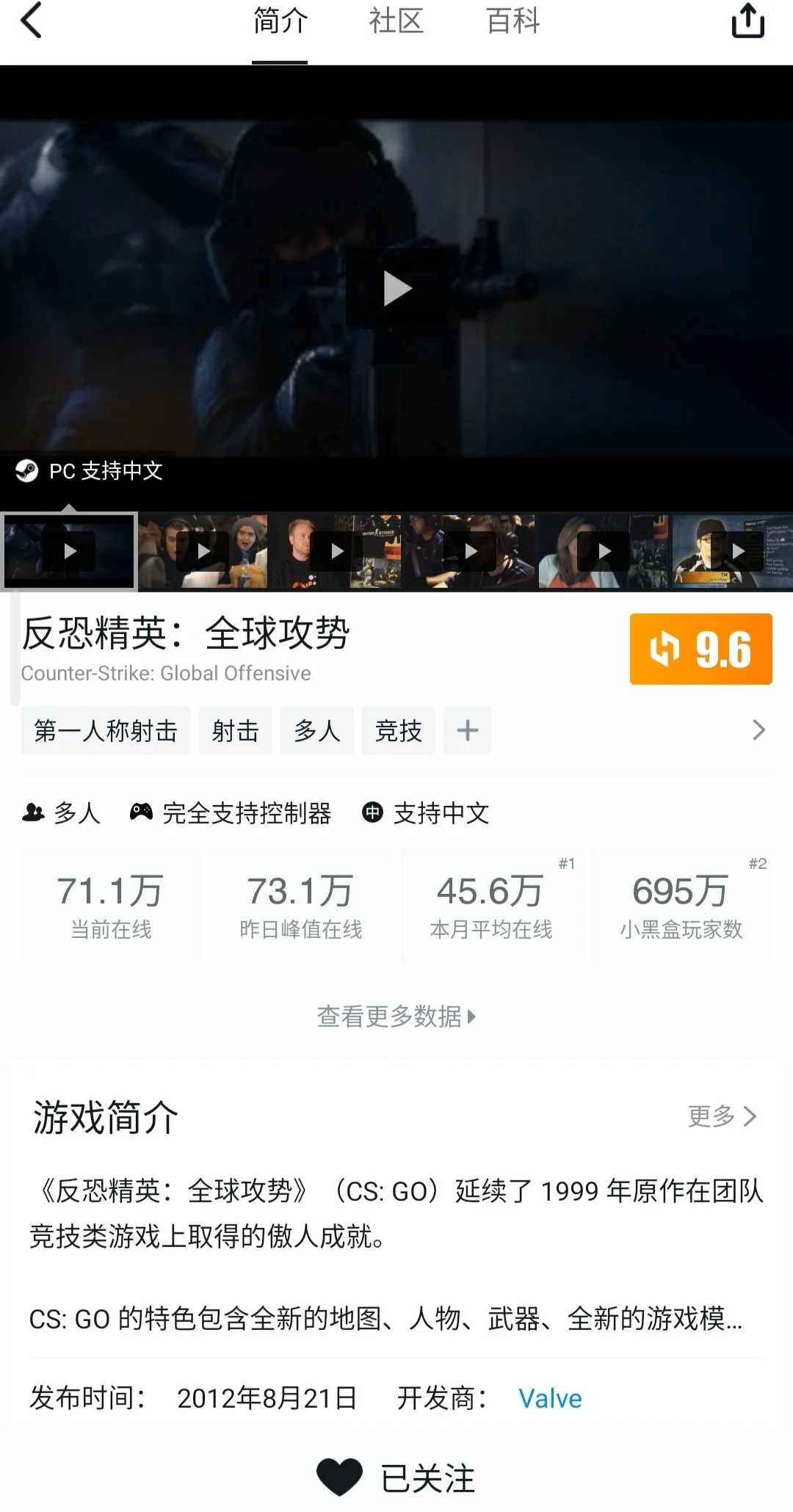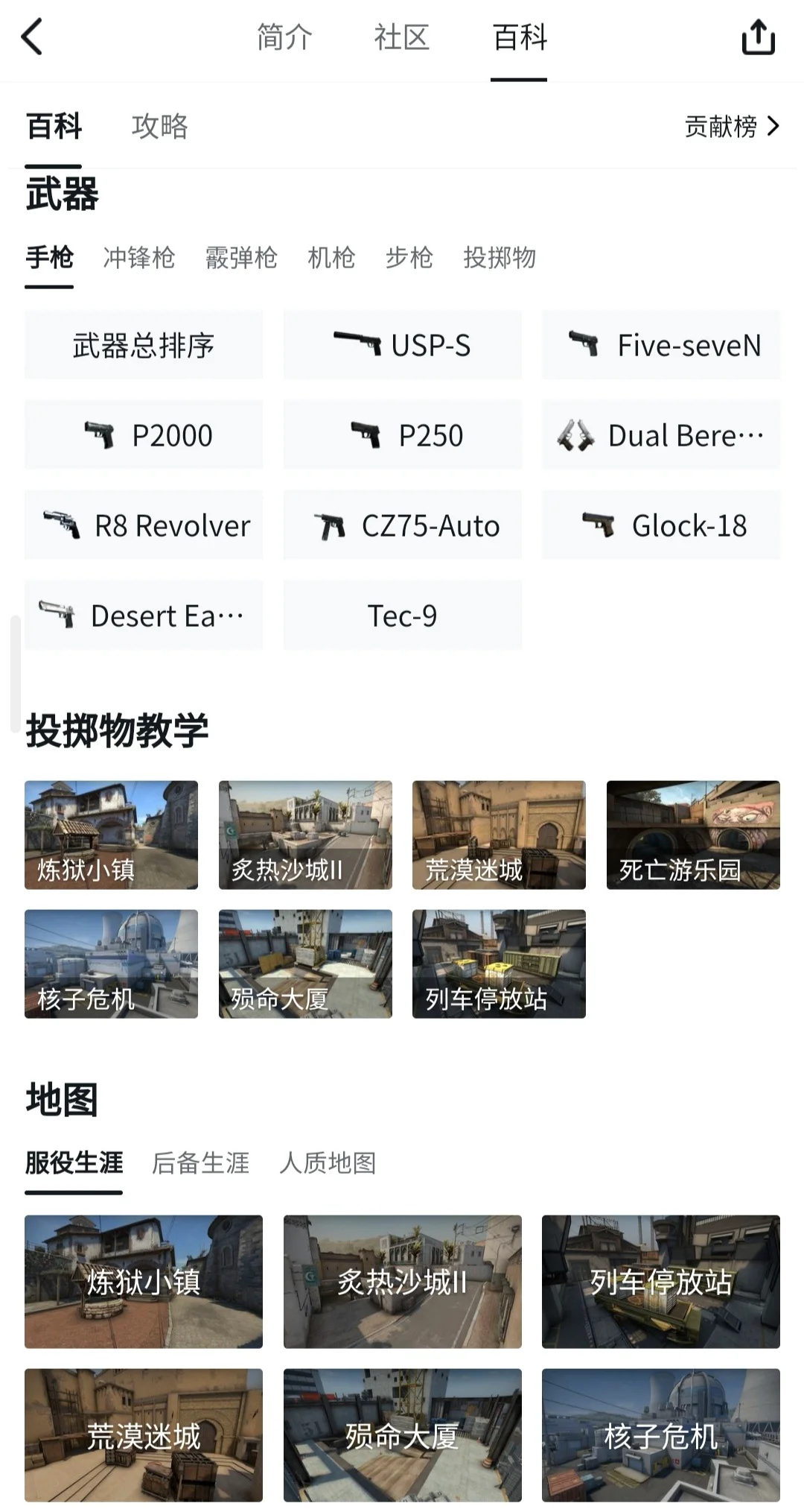 在小黑盒软件里点击游戏库,CSGO目前在PC当前在线和最受欢迎里都是前几名。进入后顶部有简介、社区和百科。百科目前还在建设中,主要分为武器、投掷物教学、地图、游戏机制等等。