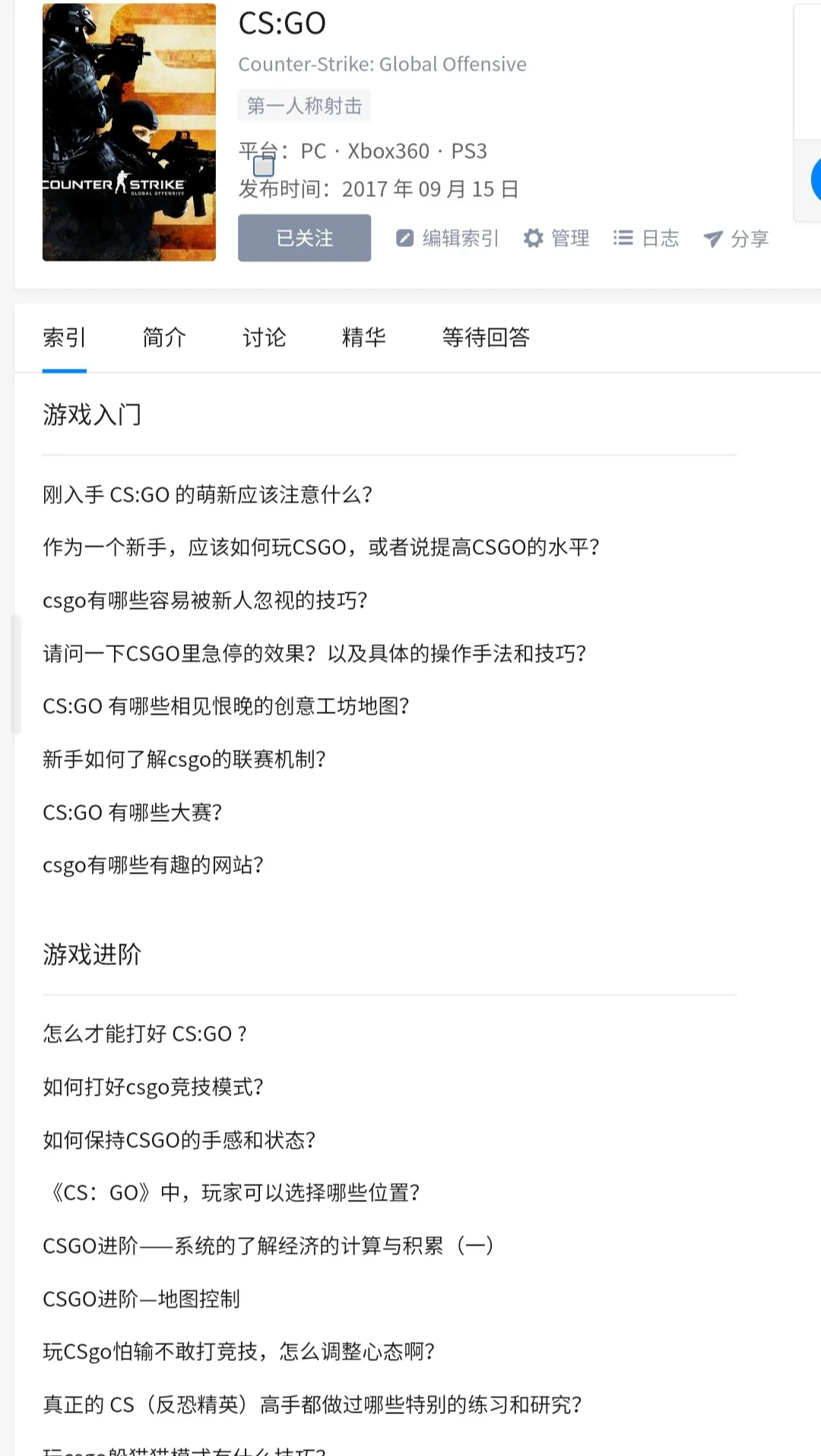 客户端的话直接搜CS:GO,进入CSGO话题页面点击精华。网页端(反恐精英:全球攻势(CS:GO))里点击左边第一个“索引”即可。