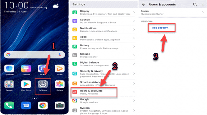 9- Go to settings => Users & Accounts => Add Account.