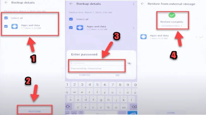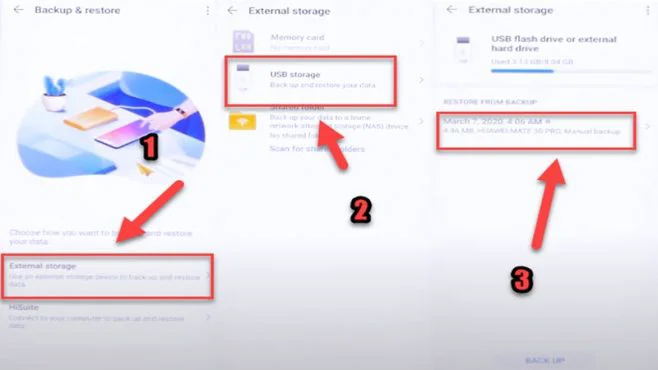 4- External storage => USB storage or Memory card=> Choose the Backup File.