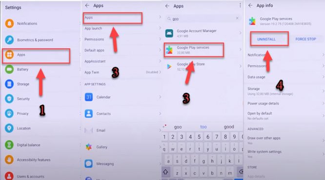 19- Go to settings => Apps => Apps => Google Play services => UNINSTALL.